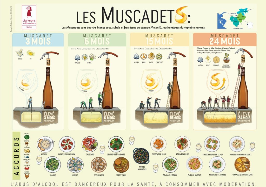 With village names of wines increasingly coming to the fore, the maturation levels of Comté cheese are the inspiration behind a new Muscadet communication campaign showing age differences between young fresh vintage wines that go with oysters, the ‘Sur Lie’ designated wines, and those finer, longer-aged expressions better suited to more elaborate dishes. As Comté cheese matures, the depth of its flavors increases, and so does its price – it’s the same with Muscadet. The Syndicat des Vignerons Independents hopes the new campaign will clarify any confusion over the distinctive Muscadet wines and their designations, differences which have largely raised the profile of contemporary Muscadet wines. (See photo of new campaign).