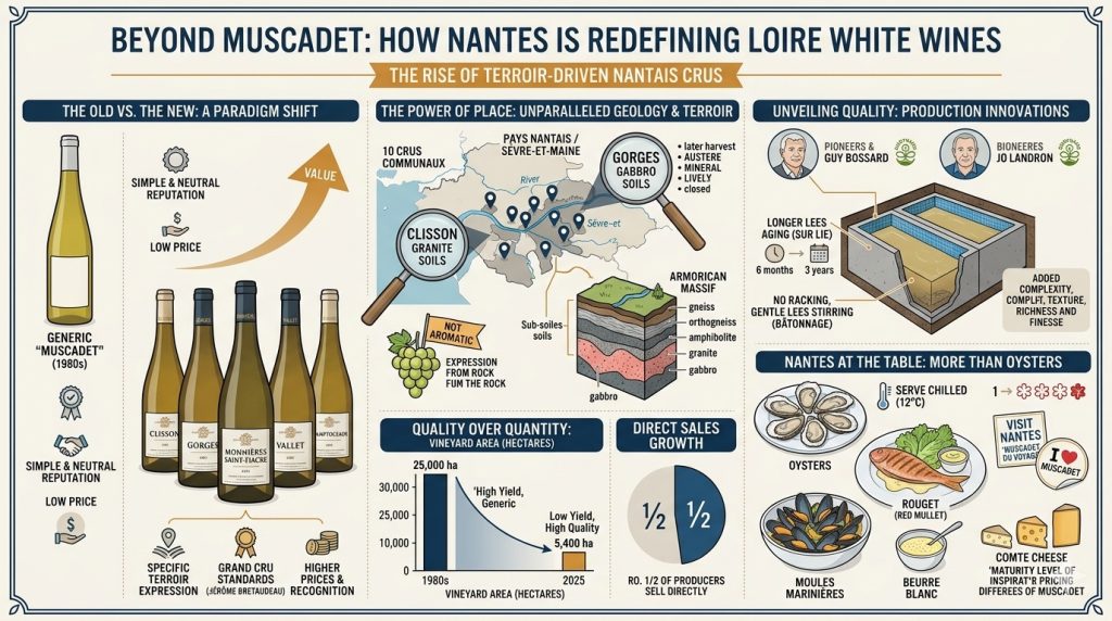 Restaurants in Nantes and the surrounding area serve Muscadet at around 12 degrees Celsius, with a Cru bottle opened at least an hour beforehand to allow it to breathe. 2025 is a top vintage in terms of quality, as are wines from 2020, 2015, and 2010, but the best years don’t all fall in the 5s.